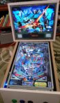 Audio wasn’t a consideration when the cabinet was drawn, so I made no allowances under the backglass for speakers. The playfield monitor has an inbuilt audio amp with small speakers. They are cut off and replaced with better speakers mounted on holes cut in the bottom towards the front. To help protect them, some of the original metal mesh is used between the speaker cones and exterior.