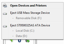 Windows 7 now comes with “diskless” option? The following is the options I have on my laptop when I click on “Safely Remove hardware and Eject Media”. The reason is because my laptops’ HDD is in a caddy usually reserved for a DVD (Lenovo T410s). I haven’t tried to eject the C Drive yet. It makes sense, although it’s stupid.