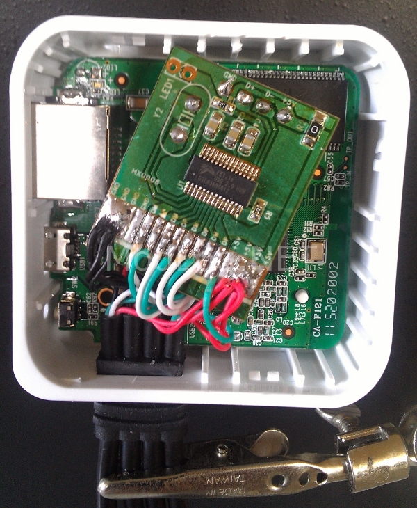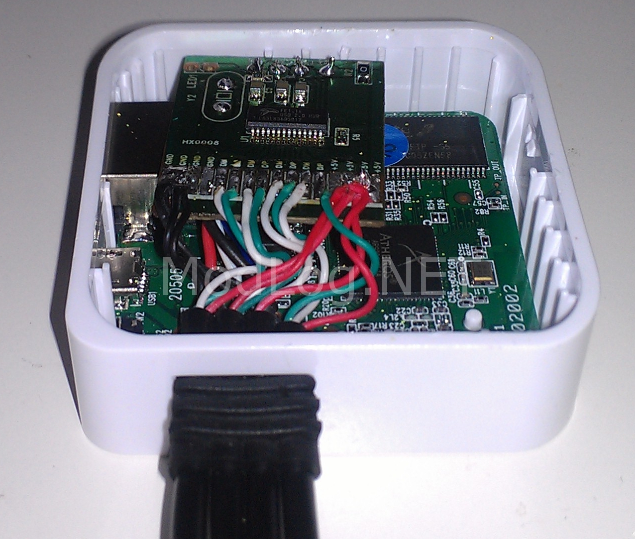 - Insert the main router and USB hub PCB’s back into the case under the USB leads, and resoldered them back to the USB PCB. You’ll notice in the first image the USB PCB is angled, this is to make it sit flat enough to allow the top of the case to fit properly.